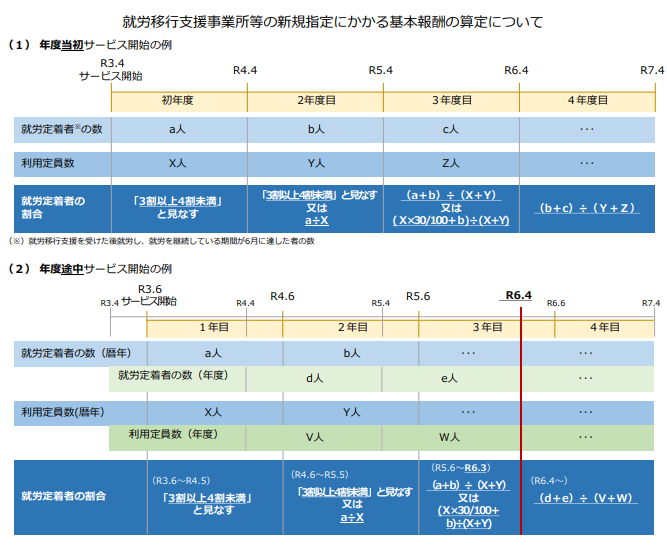 就労移行支援事業所の基本報酬は、開所から2年間は経過措置ということで、就労定着者の割合は「3割以上4割未満」とみなされます。